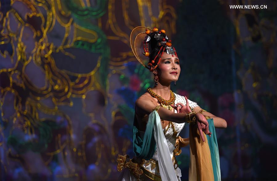 An actress performs dance drama "Tangka" in Xining, capital of northwest Qinghai Province, Sept. 27, 2017. (Xinhua/Zhang Hongxiang)
