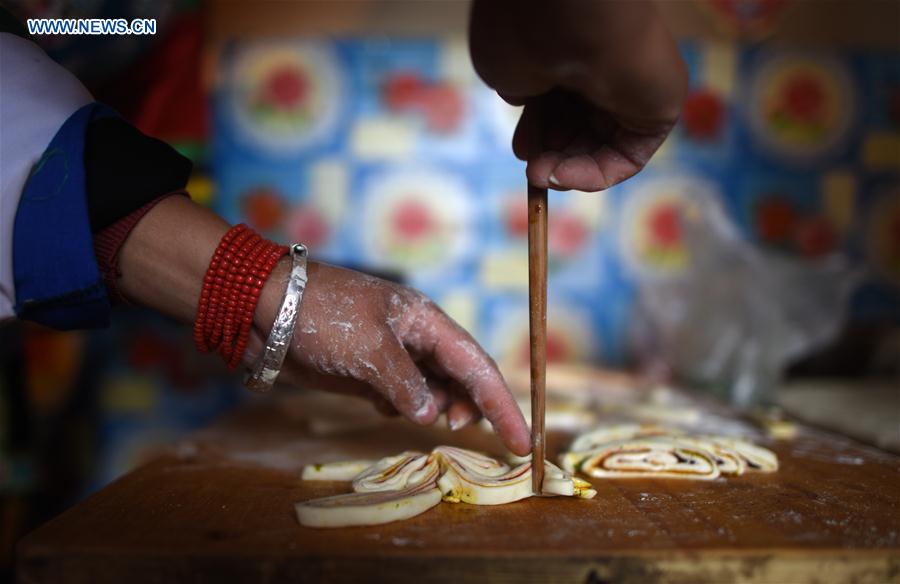 Suo Zhanhua makes dough flowers to decorate a big moon cake at Suobutan Village of Huzhu Tu Autonomous County in Haidong, northwest China's Qinghai Province, Oct. 2, 2017. The special moon cake is a traditional food of Tu ethnic group on the occasion of the Mid-Autumn Festival, which falls on Oct. 4 this year. (Xinhua/Zhang Hongxiang)