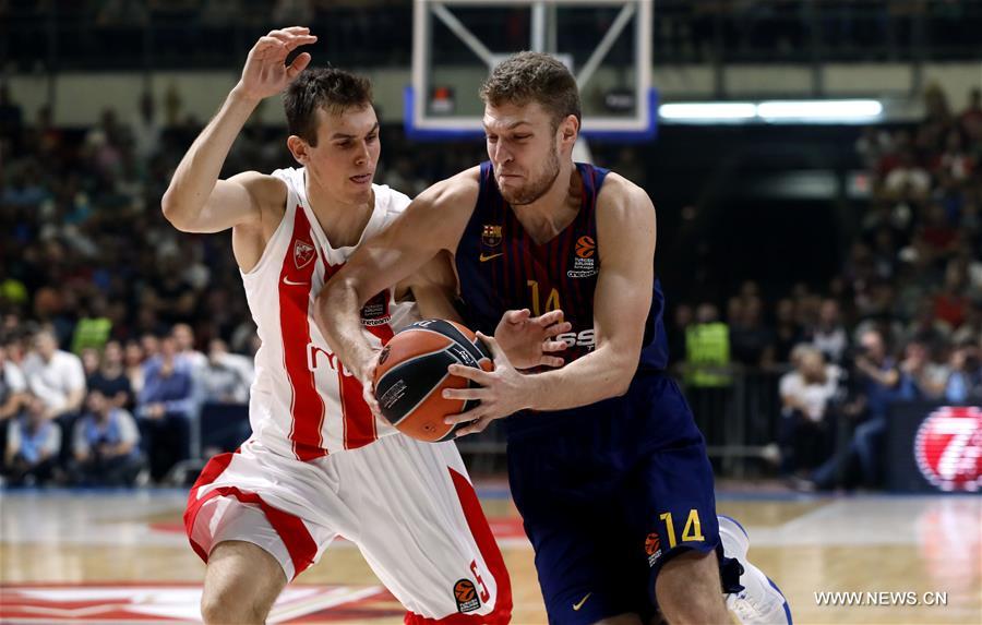 Barcelona's Aleksandar Vezenkov (R) vies with Crvena Zvezda's Nikola Radicevic during Euroleague basketball match between Crvena Zvezda and Barcelona in Belgrade, Serbia on Oct 20. 2017. Crvena Zvezda won 90-82. (Xinhua/Predrag Milosavljevic)